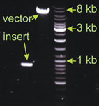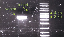In this case I did not get enough insert. The intensity of the insert band can be estimated to be 20 fold weaker than that of the vector. The insert is also bigger, it is about 4.5 kb. According to the formula I should have taken take 90 µl of the insert for the ligation! Since this was not possible I took just as much as I could 13µl. And this functioned well enough. Than means the amounts of vector and insert in the ligation reaction are not the most critical parameters. If your DNA is not damaged and you use correct restriction enzymes your ligation will work properly. Links